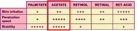 It does not contain alcohol, preservatives or other substances that are not appropriate for "open" (microneedled) skin. Contrary to Retinoic acid, Retinol acetate does not stress and irritate open skin. It is slowly converted by the body's enzymes into Retinoic acid. Dr. Des Fernandes, arguably the world's #1 microneedling expert and co-inventor of the dermaroller, has this graph on his website, concluding that Retinol acetate is overall the most stable, best penetrating and least irritating variant of vit. A (+ means "how much" so two + signs under "Skin irritation" is very good):